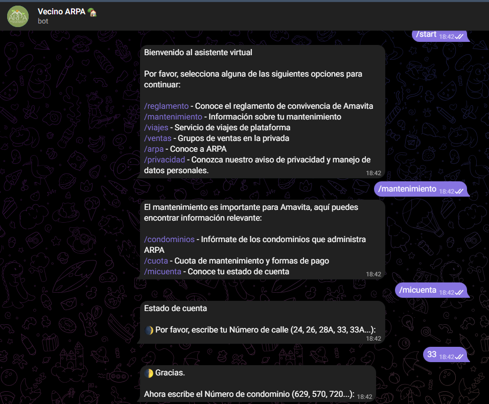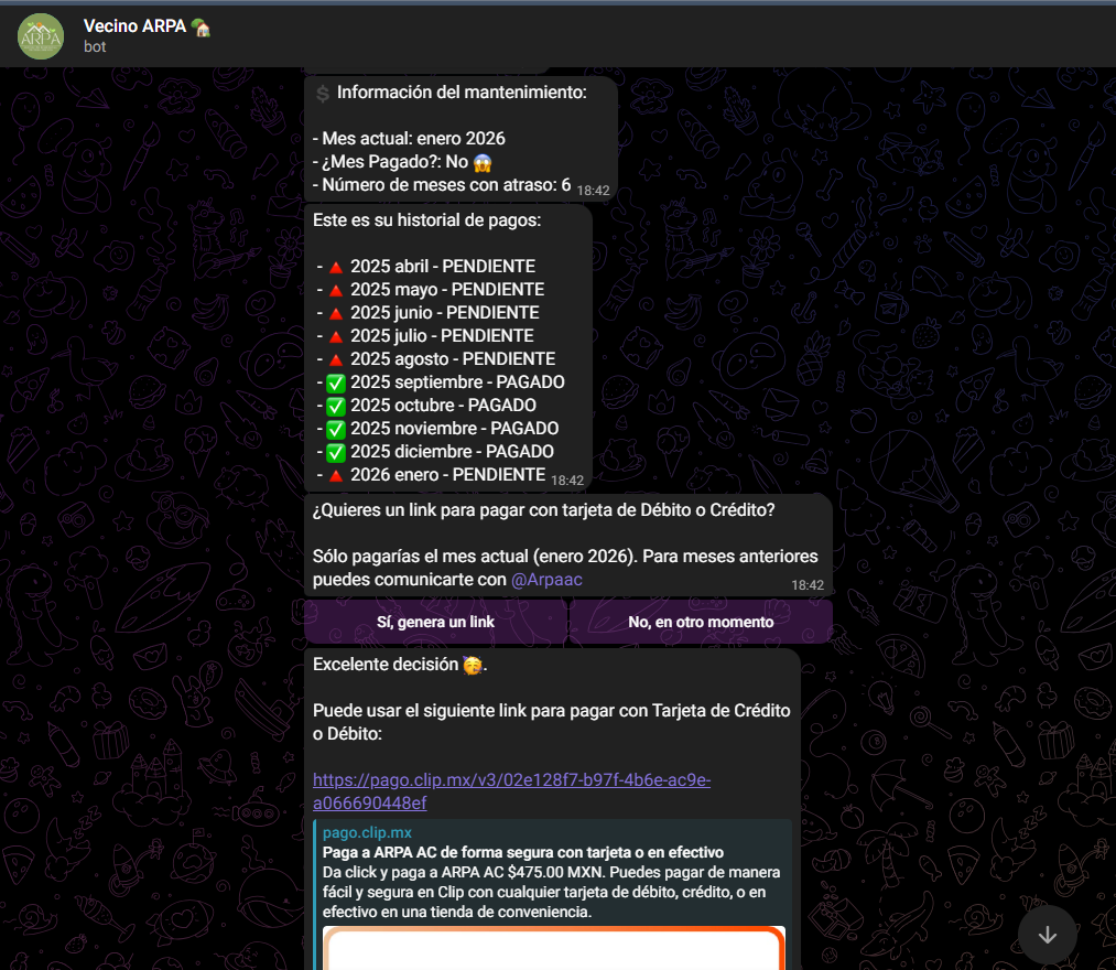 Puedes comunicarte con nuestro asistente virtual en Telegram y usar la opción /mantenimiento y /micuenta para realizar el pago de tu último mes pendiente de pago con tarjeta de Débito o Crédito.
