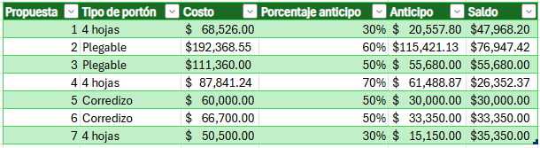 La siguiente tabla muestra las distintas opciones de portón compartidas por los proveedores. Indicamos el tipo de portón, el costo, el monto del anticipo y el monto del saldo.